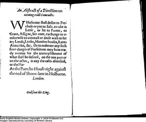This announcement for law services appears in several almanacs. This one is from William Jones's Almanac in 1627 (STC 429) . Print advertisements are normally thought of as a product of newspaper culture that would not develop until the middle to the end of the seventeenth century, when weekly or even daily periodicals were widely available and mass produced. Although this culture had started to emerge in the 1620s, most scholars locate the invention of newspapers on the continent, mostly in Holland.[1]